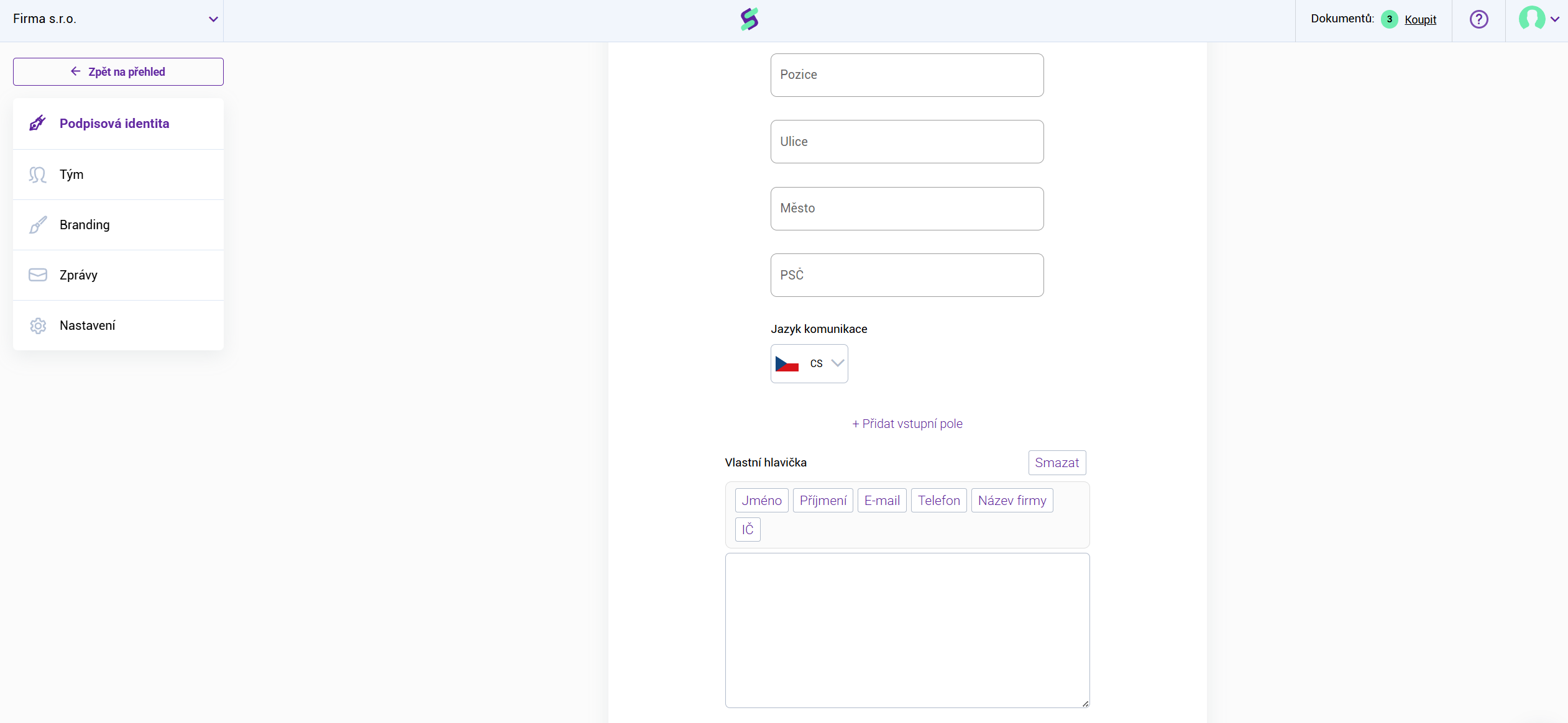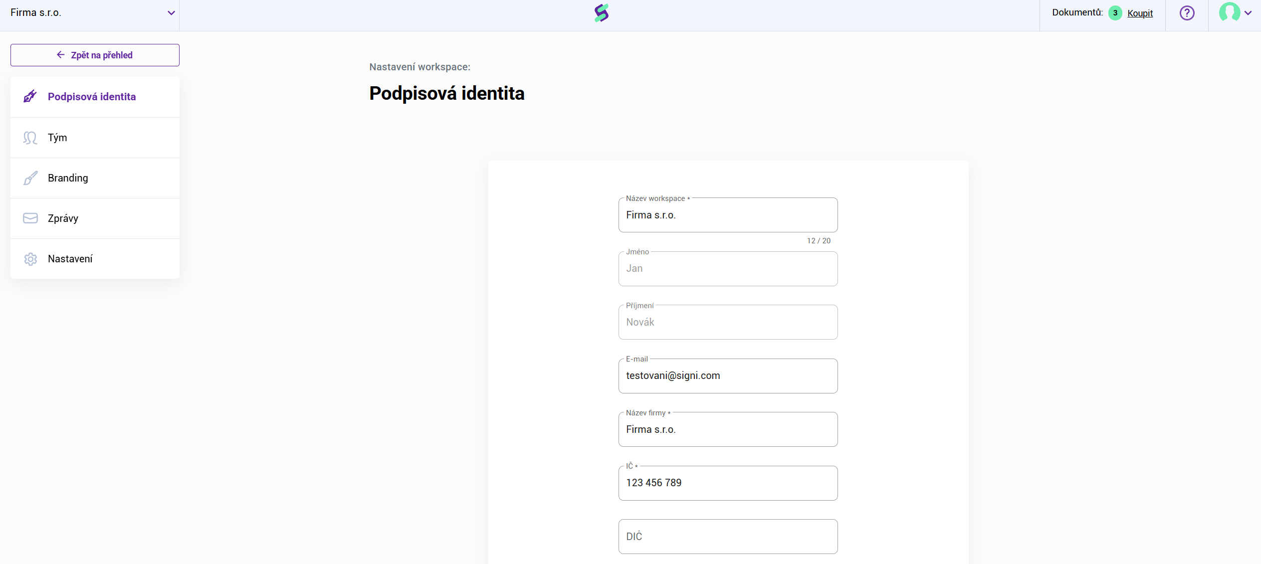 ℹ️ Poznámka: Pokud odesíláte již vytvořené dokumenty přes SIGNI – kde jen určíte, kdo a kde má podepsat – není potřeba vyplňovat podpisovou identitu.