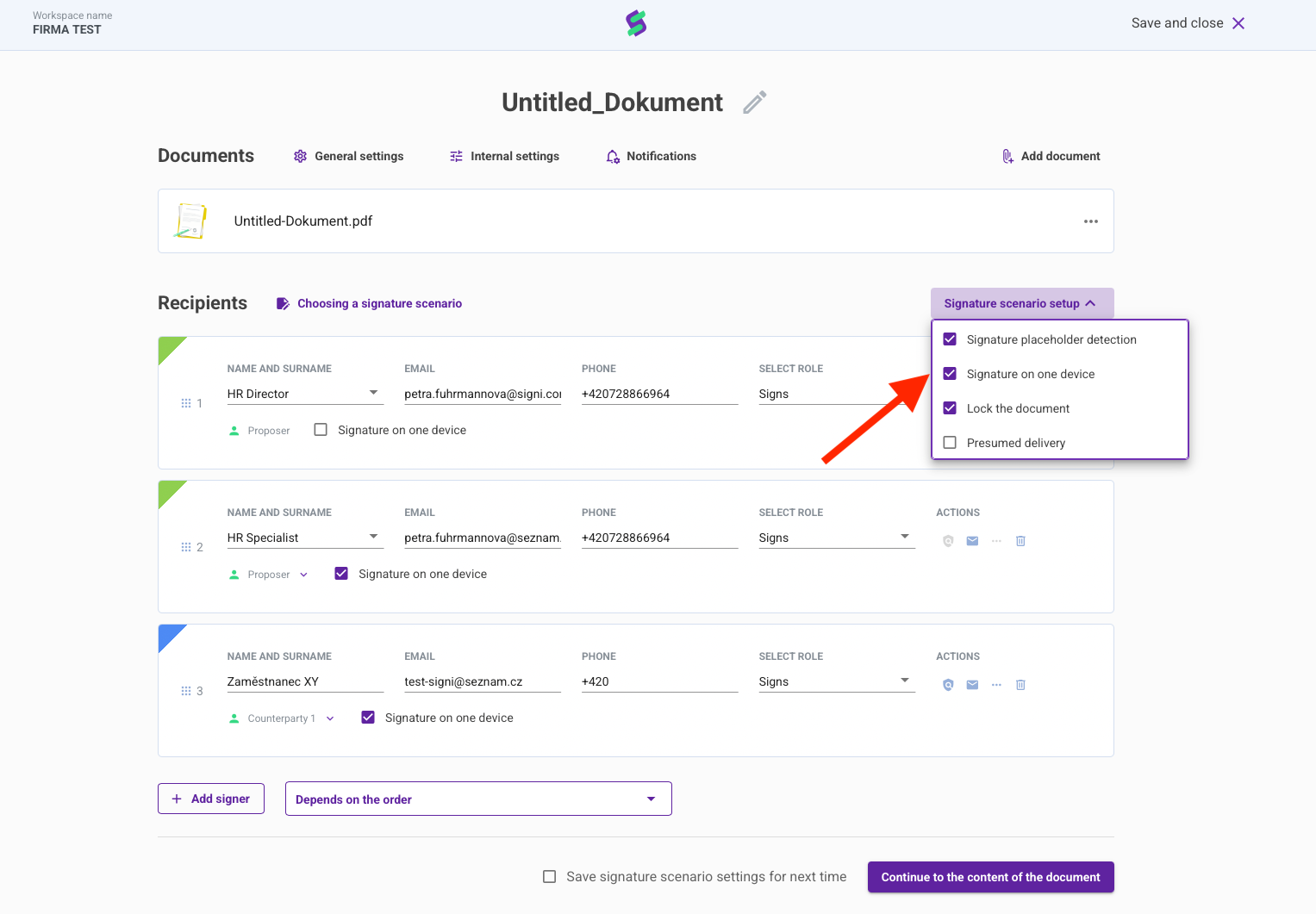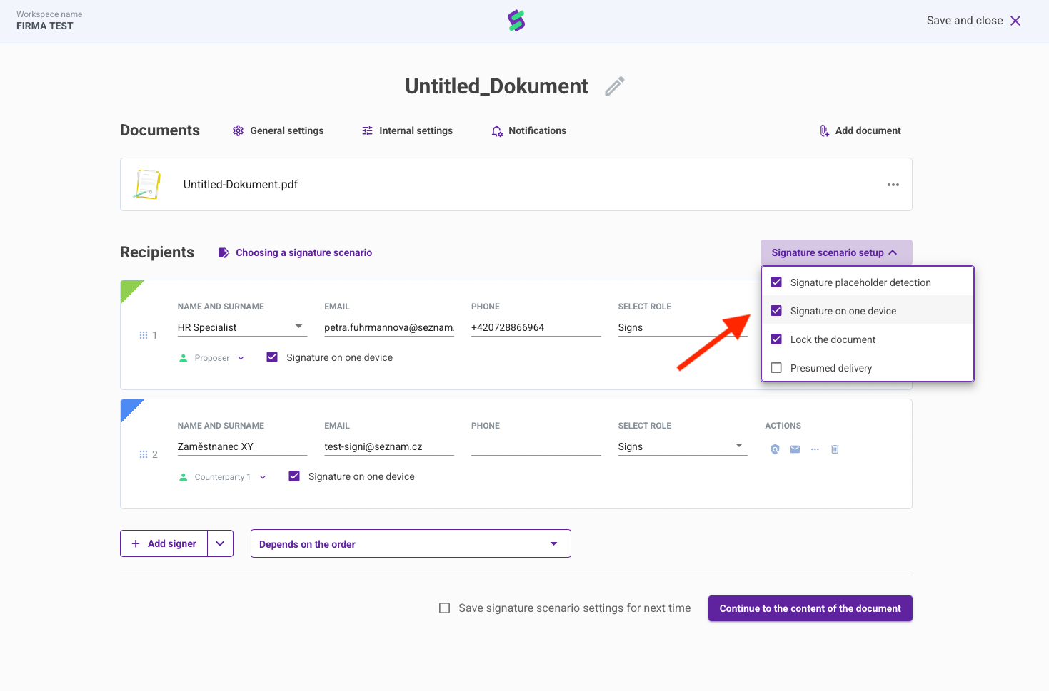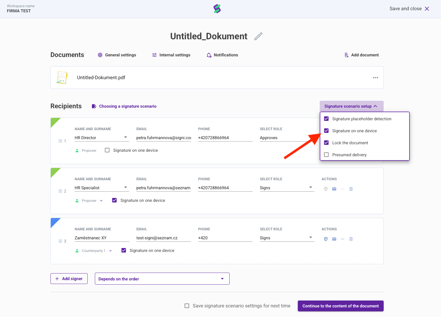"Sign on one device" is checked, which makes it possible to set this attribute for individual signatories. The HR director approves remotely. The HR specialist and employee sign on one device and have this checked in the scenario.